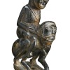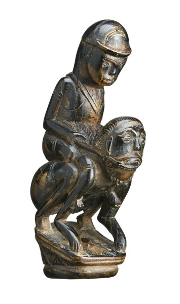 buffalo horn modelled in the form of a male figure with a cap, riding on the back of a bearded male figure, both wearing checked sarongs