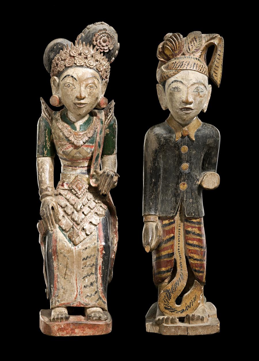 wood carved in the form of a man and a woman, painted in black and white with green, red and gilt highlights
