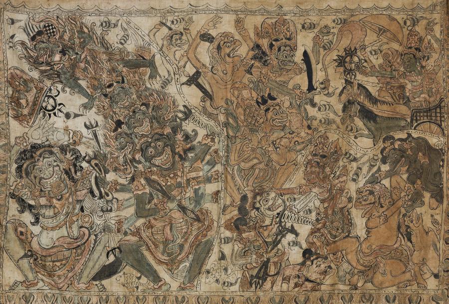 The Bomakawya (or Bomantaka) is an epic narrative relating the battle between Kresna and the Boma. The top-right scene of the painting shows Kresna enter the battlefield. The left scene is the decisive battle between Kresna in his angry thousand-headed (pamurtian) form as Wisnu on his vehicle Garuda. Wisnu (Kresna) strikes Boma on the head and his crown falls off allowing Garuda to snatch the wijayamala flower and break his resistance. This small langse has a length of red and white printed cotton fabric attached along the bottom edge, enabling it to function as a screening curtain.