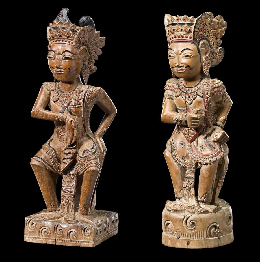 wood carved in the form of Pandu, father of Arjuna, and Raja Prabu Madhu, from the Mahabharata, with black and red highlights