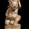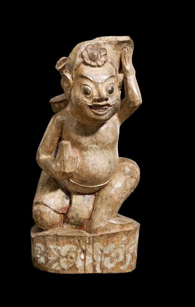 Panggal buaya (satinwood) carved in the form of a commoner wearing a kris at the back, with traces of original white, black and red highlights