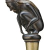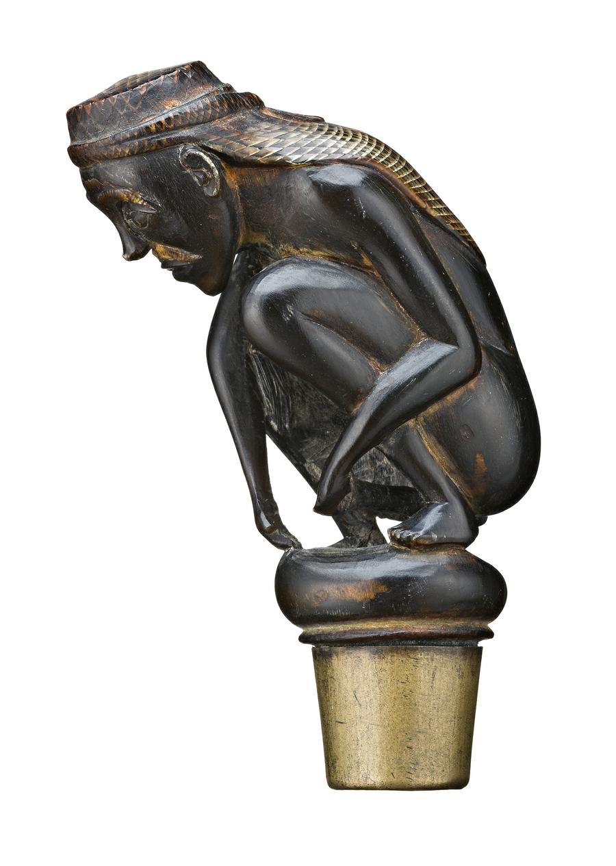 buffalo horn modelled in the form of a crouching nude man wearing a cloth to protect his head, with brass base