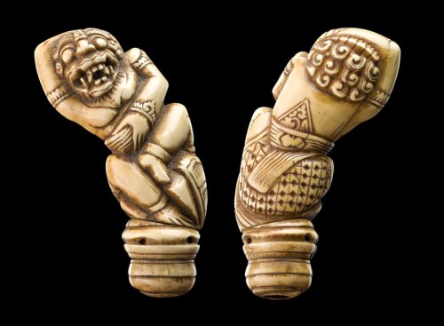 ivory modelled in the form of a demonic figure with right hand behind head and left hand on stomach