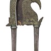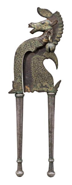 iron, forged in the shape of a horse with bells, the body with swastika (banji) motifs in bronze inlay