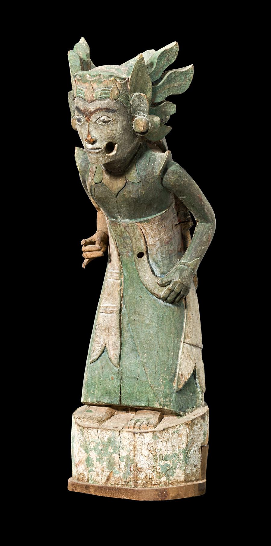 wood carved in the form of a woman wearing ceremonial dress, painted in green with white and black highlights
