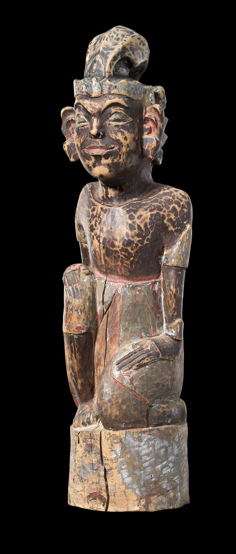 wood carved in the form of a kneeling man wearing ceremonial dress, possibly Panji, with traces of black, red, green and yellow paint