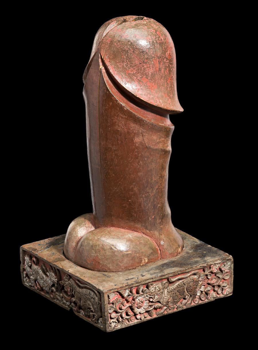 wood carved in the shape of a phallus, painted lightly in red with white highlights on a square base with four side panels carved in relief with Tantri scenes of tigers, goats and monkeys