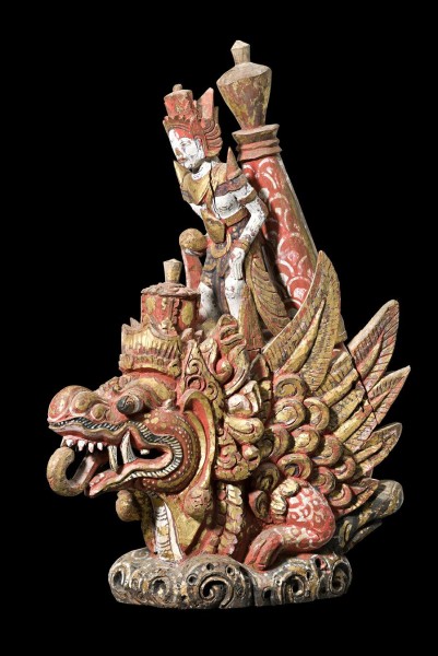 wood carved in the form of a crowned and winged dragon (naga) with the elongated stopper carved in the form of a deity, painted in vermilion with black, blue, white and gilt highlights