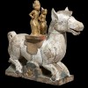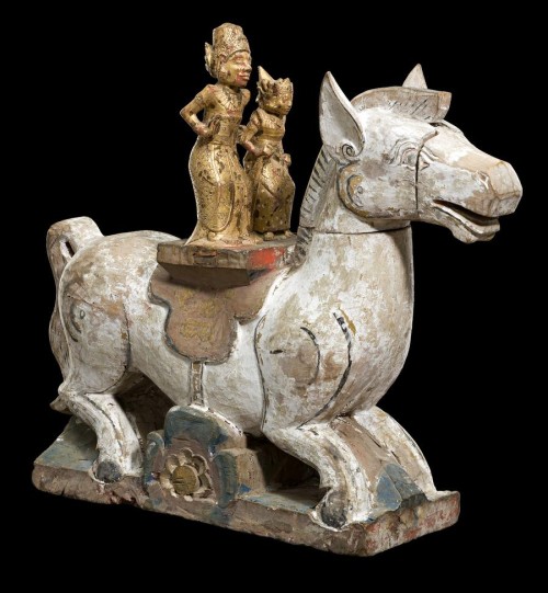 wood carved in the form of a horse with a pair of male and female deity figures (Pratima), painted in white with red, gilt, blue and black highlights