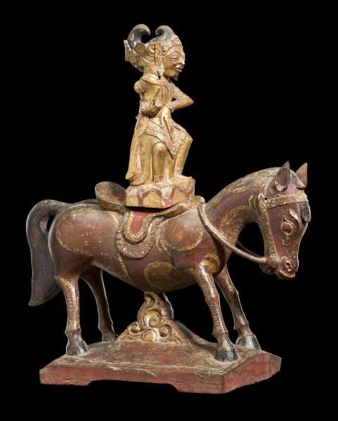 wooden offering box carved in the form of a horse with single deity figure, possibly Arjuna (Pratima) painted in red with brown, black and gilt highlights