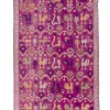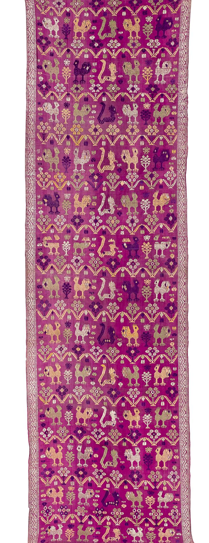 supplementary weft weave. Pink body decorated with cockerel, serpent and tree motif in purple, orange, white and green weft patterns