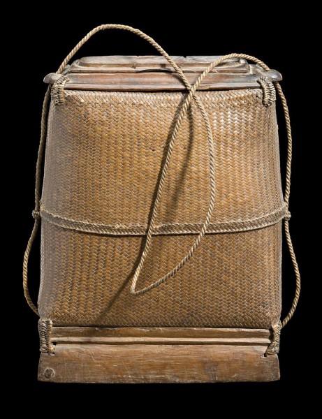 woven palm fibre basket and lid with wood base and lid top, with two internal compartments of woven palm fibre, used to carry lontar or sirih