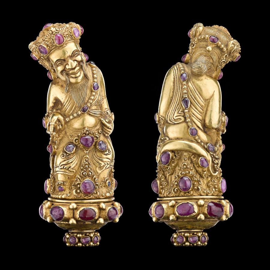 hilt of embossed and chased gold and gold inlay ring, set with semi-precious coloured cabochon cut stones