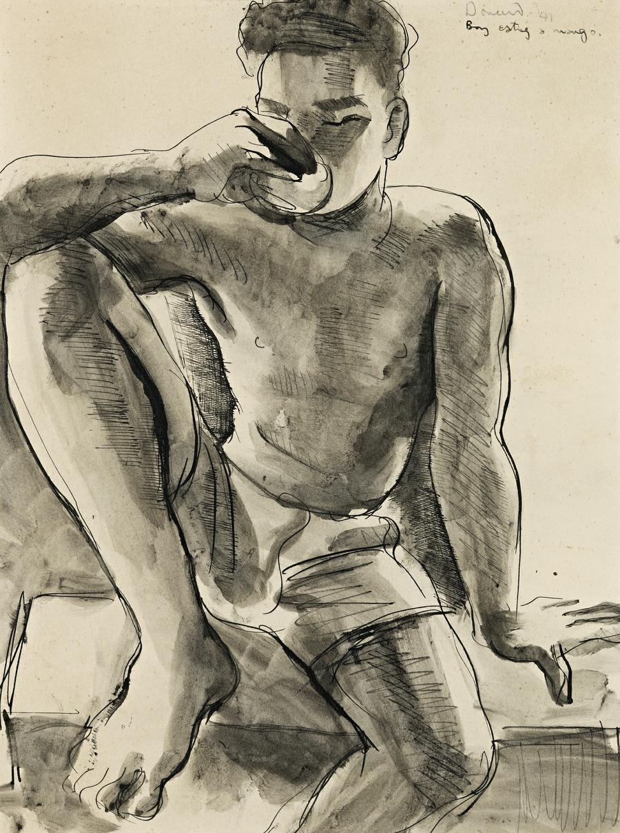 signed, dated and inscribed upper right: Donald '41 / Boy eating a mango.