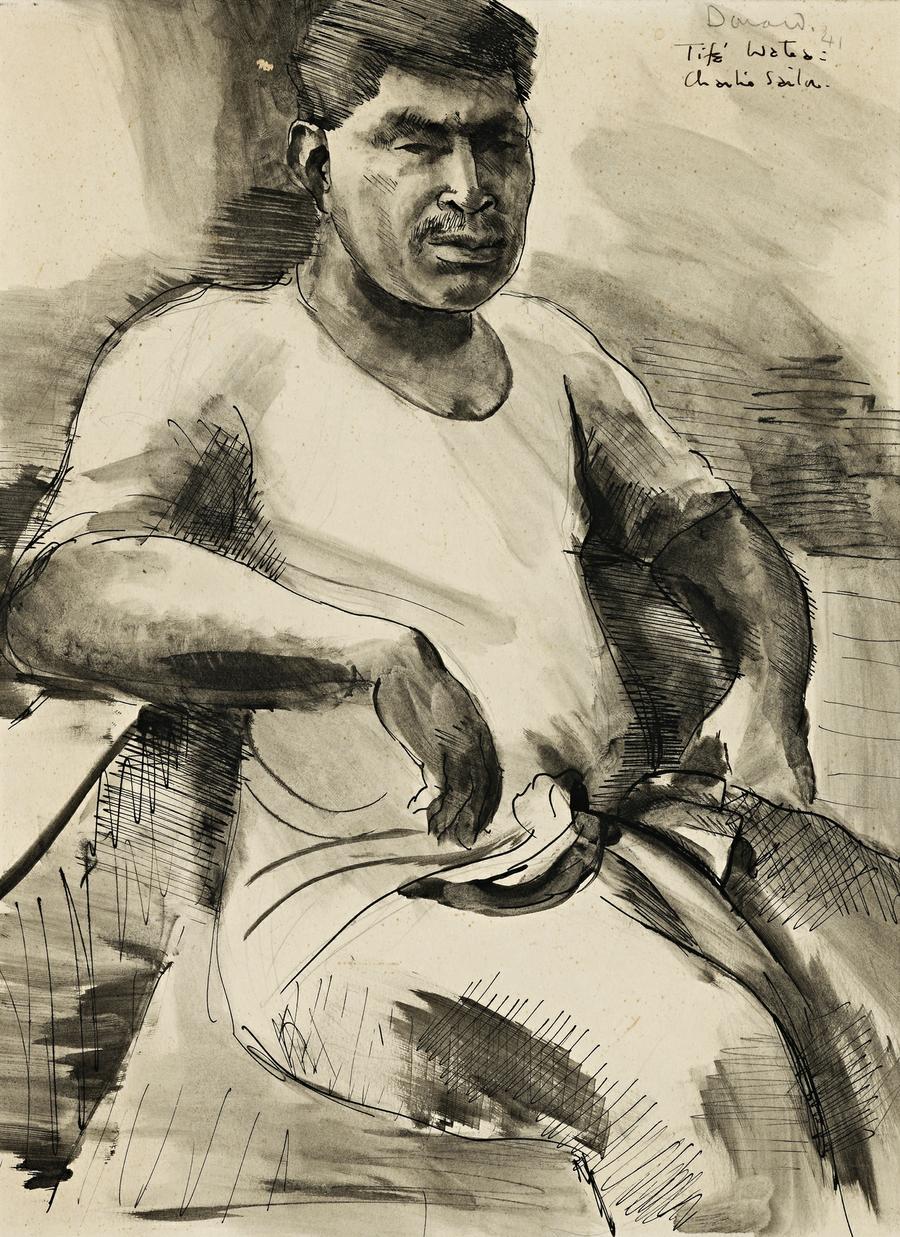 When Friend left home in 1932 he travelled north to Queensland, jumping 'rattler' trains and making his way, living the existence of a hobo, to Cairns. Here he found his first real experience of the alternative cultures that would continue to entrance him throughout his lifetime. At Malaytown in Cairns he became adopted by the Sailor family, whose patriarchal head was Charlie, portrayed in this drawing. The Sailor family were Torres Strait Islanders who worked pearling luggers between Cairns and Thursday Island, and who treated the artist as one of their own. After leaving West Africa at the end of 1939, following the declaration of war in Europe, Friend stayed with them again until early 1942, when he returned to Sydney and joined the army.1