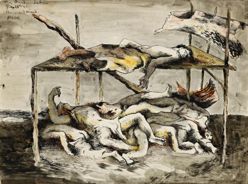 Donald Friend accompanied the Australian forces which landed on the island of Labuan, off the coast of Borneo, in June 1945. The first drawings Friend produced on Labuan depicted the devastated landscape, the troops and the native people. By late June he had made his first studies of the bodies of Japanese soldiers, who had been killed when they infiltrated the harbour area. These drawings included simple pen and ink works showing tangled piles of bodies and a coloured drawing of two bodies, on and under a table like structure. Friend also drew quick studies of the bodies of the last large party of Japanese encountered on Labuan, depicting them laid on and around a makeshift platform. These drawings became part of a larger coloured work entitled 'Nature morte (Still life)' and together they form the basis of this large painting he produced after his return to Sydney in October 1945. 'Japanese dead from suicide raid' was painted in November 1945 while Friend was staying with Drysdale, and aspects of the picture show the influence the two artists had on each other. The work shows a twisted sinuous jumble of dead bodies lying on top of and below a large sheet of metal. The mainstays of Friend's art are the male body and an interest in colour and decorative composition. This work incorporates these elements creating a sensual image, despite its gruesome subject. A related painting of the same title, created in 1946, is part of the Newcastle Region Art Gallery collection.'1