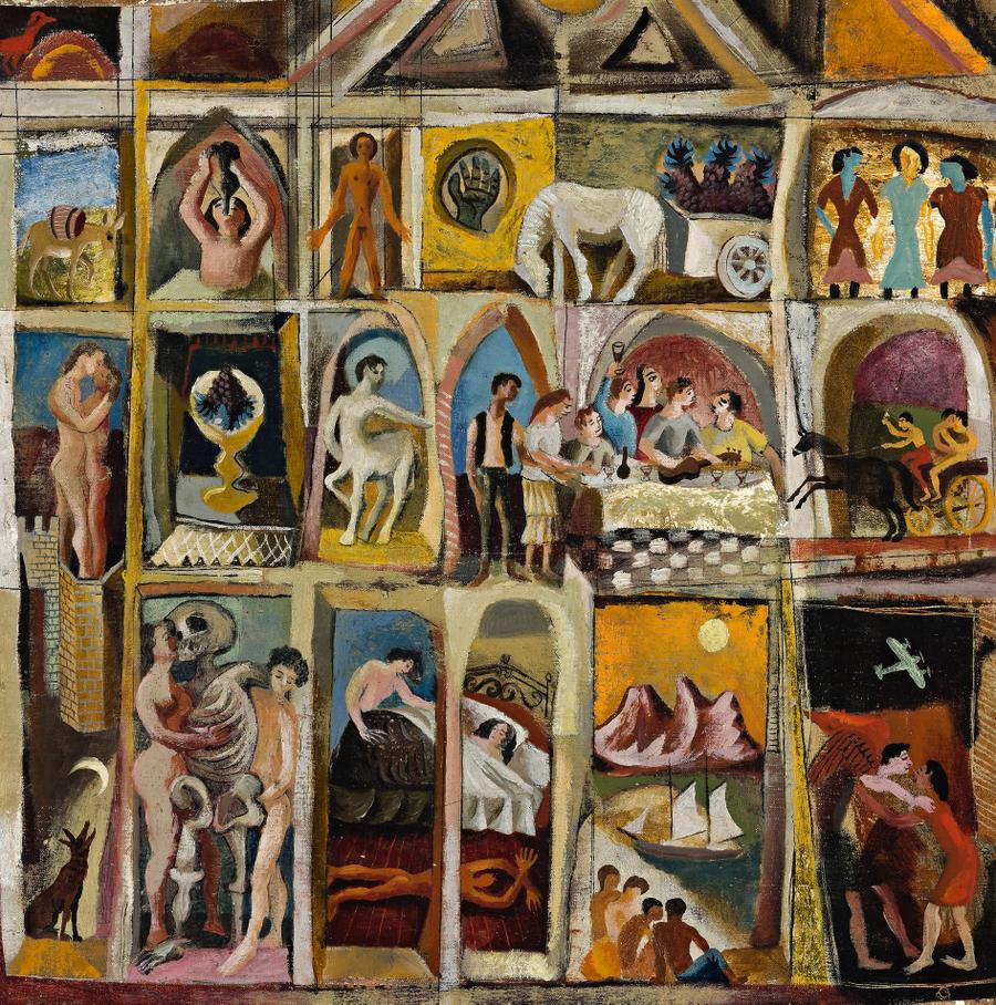 Donald Friend first visited Italy in 1949, enjoying in particular the early Renaissance art, especially the wondrous treasures offered by the city of Florence on the River Arno. Overwhelming at any time, their first sight is like a flood. As Robert Hughes said of Friend's experience: 'A young painter who has not been to Italy before arrives there; he goes, let us say, to Florence, and he is swamped. There is so much to take in, and he becomes a mass of ecstatic confusion.'1 Friend's response in paint was A Drowning Man's View of Florence, c1949, divided into sections, of rounded or pointed arches and rectangles, peopled with activities as numerous and varied as the city had to offer. Overall, it looks something like an altarpiece from that time when the International Gothic style was giving way to the early Renaissance, yet remaining entirely modern. While the banqueting table would have been a familiar Renaissance sight, an airplane flying overhead was not. Death embraces the maiden, a dog howls under a crescent moon, a centaur emerges from classical mythology, and wine is drunk. Of all the busy little vignettes, the loving embrace is the most frequent. The viewer is flooded with the images of his experience of this hot house of art and way of life, almost without rival. Perhaps, above all else, early Renaissance Florence is the unrivalled place to study the human figure - for sculpture from the hands of Donatello in bronze and marble; and in painting the tactile marvels of Masaccio. It was this young genius, who even Leonardo and Michelangelo visited at the Brancacci Chapel to see his frescoes, and draw the figure after him. Friend's drawing of the male figure gained much during his visit, seen immediately in the masterly pen, ink and wash, Youth, Death and the Maiden of 1949, and witnessed in his many splendid works thereafter. The subject of A Drowning Man's View of Florence was important to Friend for he painted a second, slightly smaller version (private collection), which was included in his retrospective exhibition held at the Art Gallery of New South Wales in 1990. Some images are repeated; others include Bacchus the Roman god of wine, singing birds, and a fountain. The horse to the right might have stepped straight out of a painting by the Florentine Paolo Uccello, whose love of perspective rivalled even that of his wife.
