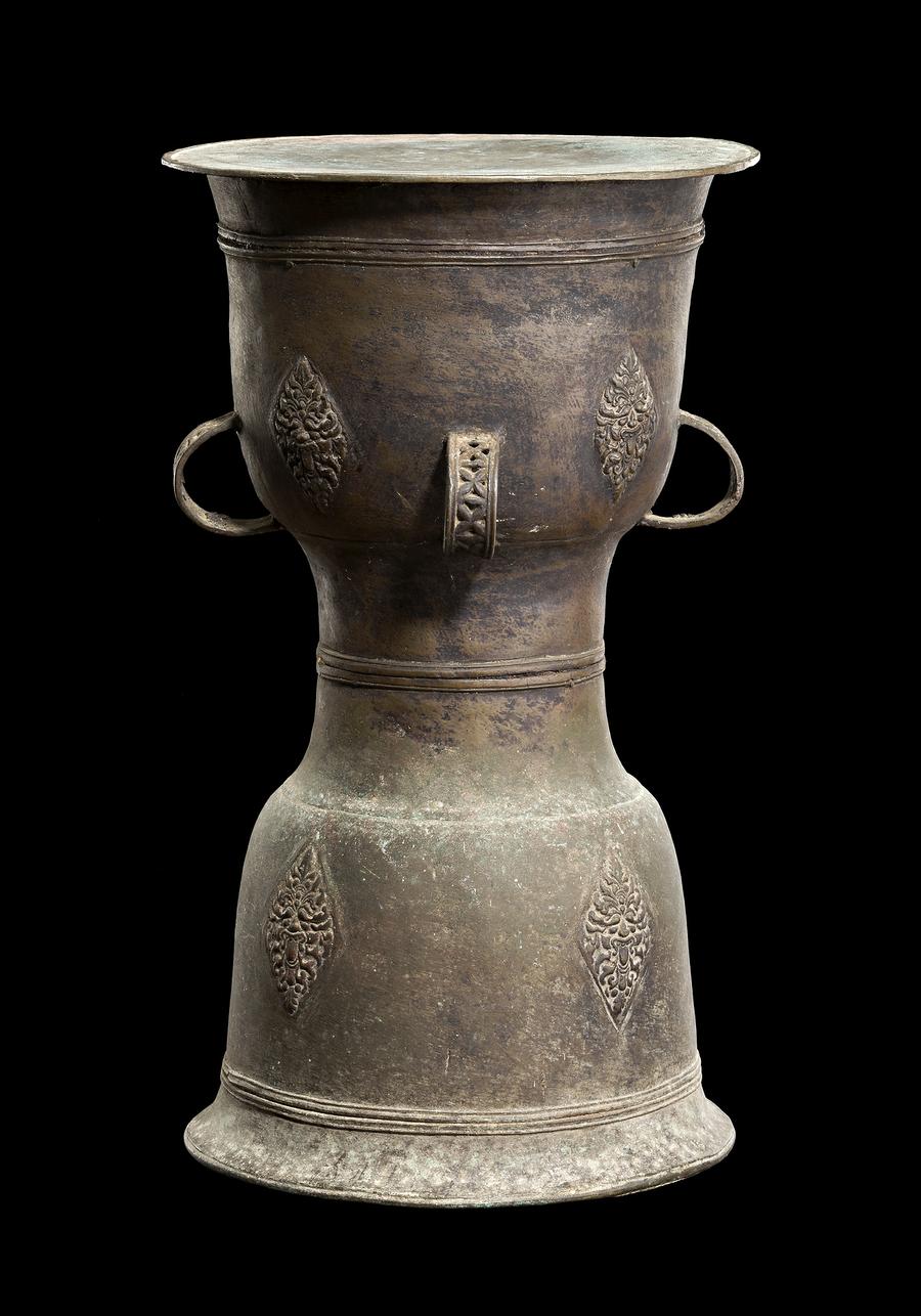 bronze, hourglass shape with four handles, decorated with motifs of kala face and protruding tongue in lozenge shape