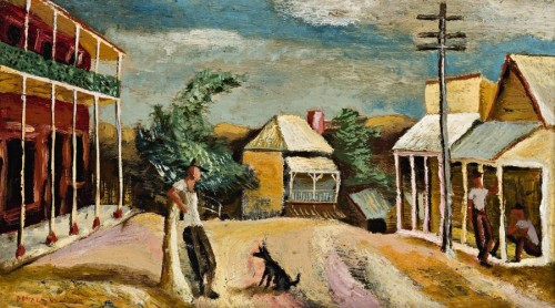 Populating his oeuvre with drawings, watercolours and oils of Hill End, the pub and the store featured both for their picturesque appeal and as places of general meeting " as witnessed by the locals in our painting. The presence of the black dog seated in the main street adds a further touch of the informal, the whole painting redolent with indolence and the laconic lean. In the warmth of a sunny day there are no clouds of significance, real or metaphoric, to trouble the scene, even if the roads appears to fall off the end of the earth once past the rise. The abrupt fall does, however, have a hint of Surrealism, so apparent in Drysdale's The Cricketers and other Hill End works. There was a strong affinity between Friend's and Drysdale's work at this time seen also in the lean and lanky. In later works, such as (Hill End Landscape), c1951 in the collection of the Tasmanian Museum and Art Gallery, Hobart, the unique locale brought out even more the latent Surrealism in Friend's work. By 1949, Friend had been living there long enough to imbue Hill End, The Royal Hotel and General Store with all the local character, found as much in the architecture as in the hatted individuals themselves.