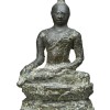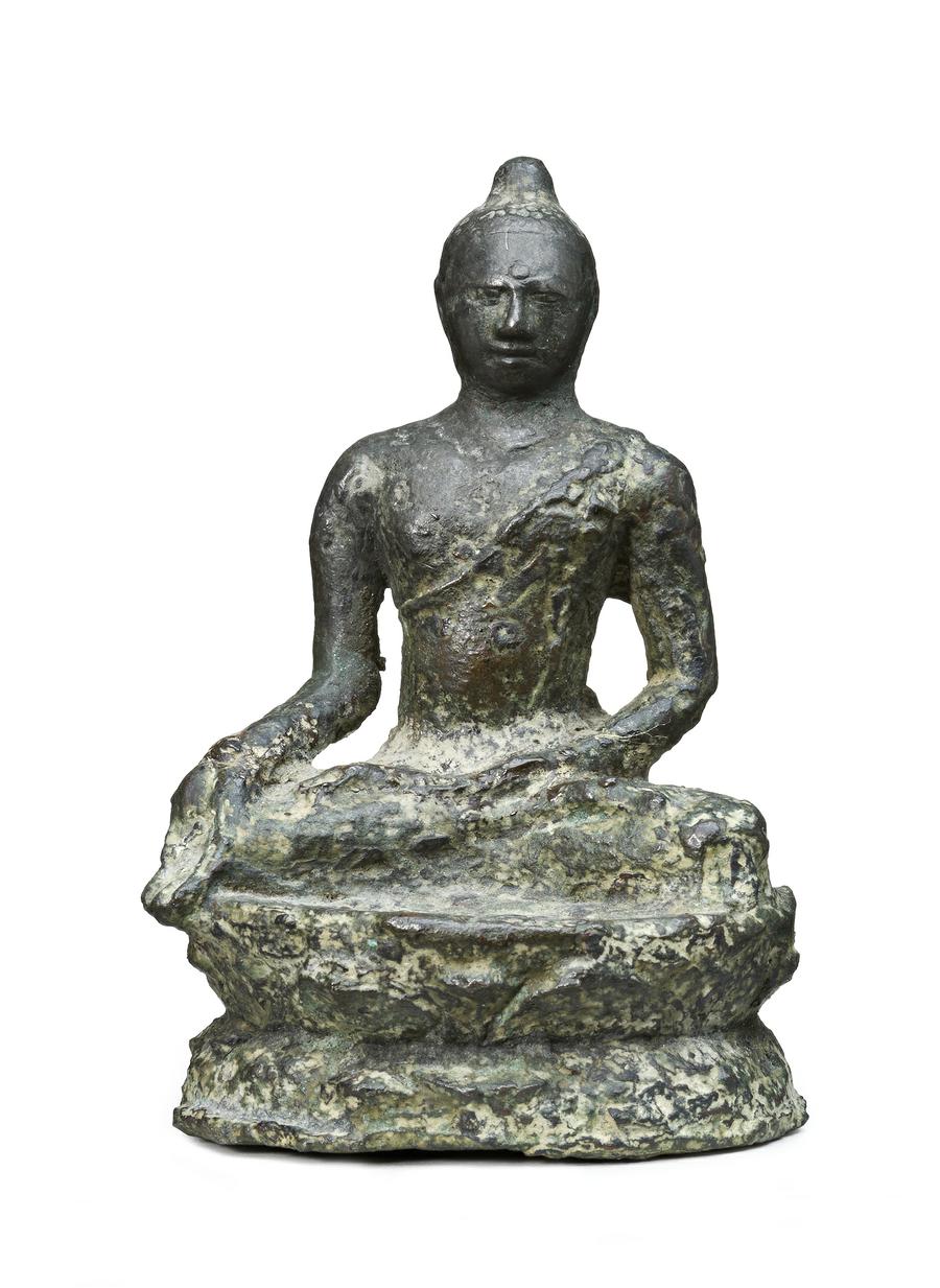 bronze, depicting Buddha in meditation on a pedestal with his left hand on his lap and right hand outstretched in bhumisparsamudra, whereby he called on earth to witness his victory over Mara, signifying his enlightenment