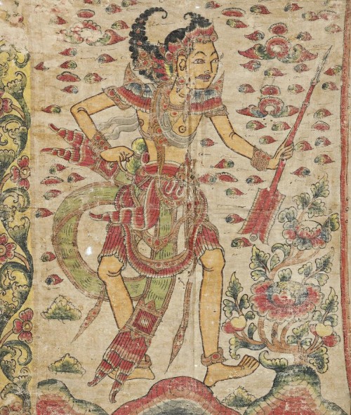 Rectangular flags (kober) are produced in pairs with the same image on both sides, so a pair of flags consists of four pieces of painted cloth. They usually feature a pair of opposed but complementary figures, expressing duality or balanced opposition. These two works (Lots 191 and 192) feature the figures of Laksmana and a demon general from the Ramayana. Flags are displayed by inserting a bamboo pole along the seam in the side of the cloth.