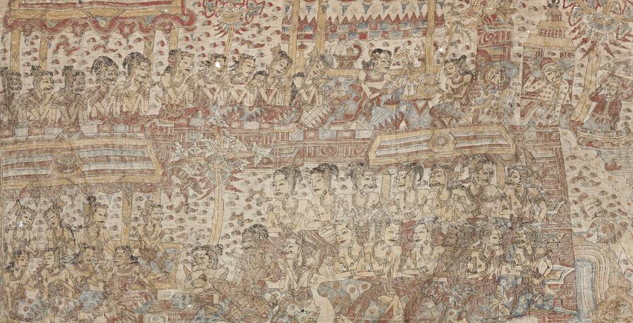 Langse are rectangular cloths used as curtains to screen offering platforms. This painting depicts episodes from the Malat narratives, including the landing at Tuban on the north coast of Java by the King of Malayu. The king of Malayu is a prince of the Javanese kingdom of Daha who has gone overseas and been adopted as successor by the old king of Malayu. This story provided opportunities to depict foreign sailors, in this case mainly Chinese.