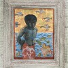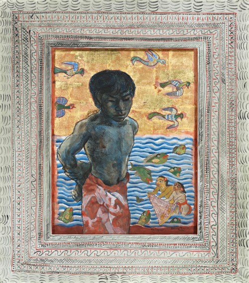In The Lagoon, c1975, Friend responds to this tropical abundance of colour, life, and the physical dignity and attraction of the native peoples. The model, surely one of his houseboys, is drawn with all the masterly skill Friend had at his fingertips, the sensitivity of line and painterly flow matched by the sensitivity of the concept itself. West meets East in the placement of the figure against a backdrop of patterned waters, flowing rhythms of wings and waves, of motifs inspired by the art around him. The illusion of the three-dimensional contrasts with the decorative flatness, acting as a metaphor of the differences between the cultures, enriched by the gold leaf of plenitude in celebration of the exotic.
