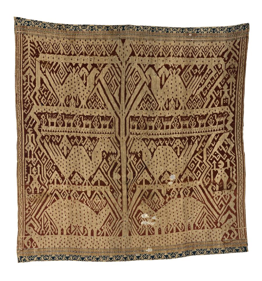 This textile from the Lampung region of South Sumatra was made during the 19th and early 20th centuries. Such cloths are referred to as 'ship cloths' because of the obvious ship motif which symbolises the transition from one stage of life to another. The textiles were used in a range of transition rites, as part of ritual gift exchange, as ceremonial seats for the bride and groom and as pillows for the deceased.