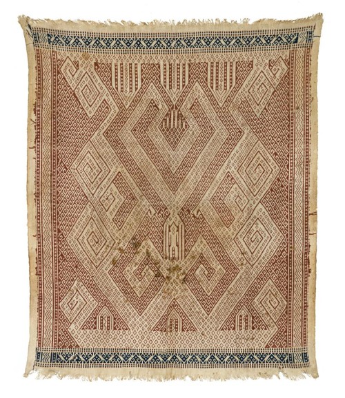 This textile from the Lampung region of South Sumatra was made during the 19th and early 20th centuries. Such cloths are referred to as 'ship cloths' because of the obvious ship motif which symbolises the transition from one stage of life to another. The textiles were used in a range of transition rites, as part of ritual gift exchange, as ceremonial seats for the bride and groom and as pillows for the deceased.