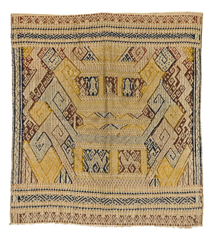 This textile from the Lampung region of South Sumatra was made during the 19th and early 20th centuries. Such cloths are referred to as 'ship cloths' because of the obvious ship motif which symbolises the transition from one stage of life to another. The textiles were used in a range of transition rites, as part of ritual gift exchange, as ceremonial seats for the bride and groom and as pillows for the deceased.