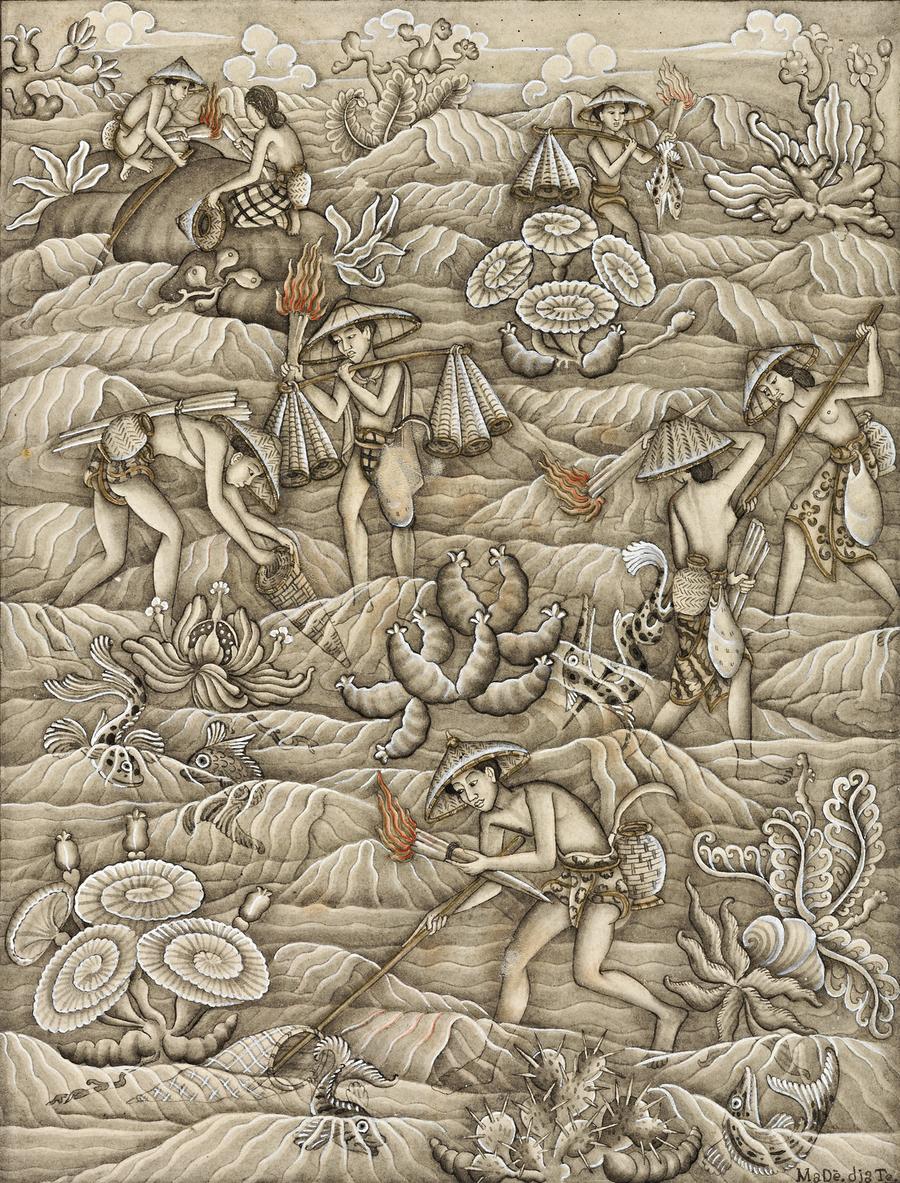 A self-taught artist who learned by watching the famous Ngendon, the first of the modern Batuan artists, at work. He was a member of the Pita Maha group and showed his work to the European artists Bonnet and Spies for criticism. There are twenty-seven paintings by him in the Bateson-Mead Commission (H. Geertz, 1994, p. 104). He developed his style of painting independent from the influential Batuan artists of Ngendon and Mura. He was also a renowned teacher of art in Batuan, and the Batuan style today still bears the influence of Jata's works and teachings. He continued to paint well after the war, however in May 1994, he expressed a wish to give up his art due to his age (Hohn, 1997, pp. 53-58).