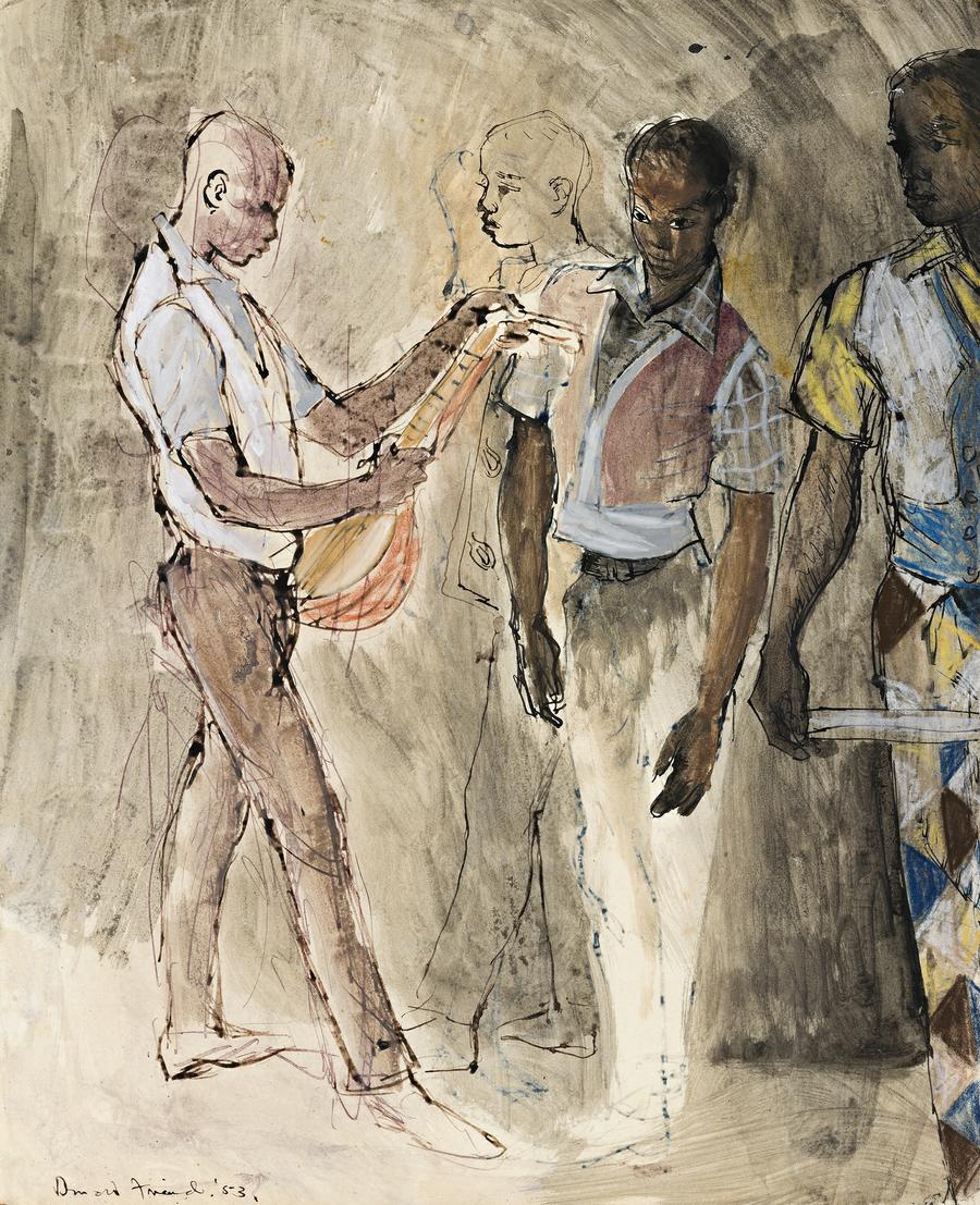 Following his rushed visit to Spain in September 1952, Friend returned to London early in October for the opening of his exhibition at the Redfern Gallery at the end of the month. In the meantime he met Omu, an Ibadan boy whom he had first seen at Lapido's house when he was in London two years earlier. The meeting stimulated a period of work which included some of the artist's most beautiful figure drawings: 'These days have been very happy. I have done excellent work - my hand has found a great certainty' Each day Omu comes, poses while I draw, helps me get lunch, amuses me and as it were wraps me in his warm affection, so simple and trusting. Now this I know is exactly that sort of relationship I searched so long for' Perhaps I understand and sympathise more with Africans, in any case I know I shall not be fooled and betrayed' (diary entries 19 and 22 October 1952).