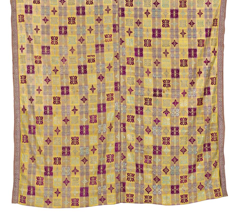 silk, silver thread, cotton, supplementary weft weave. Checked pattern with star motifs in silver and pink weft patterns. Balinese aristocrats of the early twentieth century are often shown in photographs wearing a lower garment with these distinctive checked patterns. The large garment is two separately woven pieces joined to produce a single panel