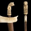 steel blade decorated on each side in relief with three standing priest figures and a winged elephant, the scabbard of wood with a modelled ivory crosspiece; the bone hilt carved in the form of a demon, raksasa, wearing a snake for a necklace