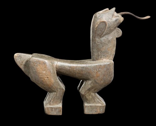 wood carved in the form of a zoomorphic figure with serrated iron tongue