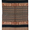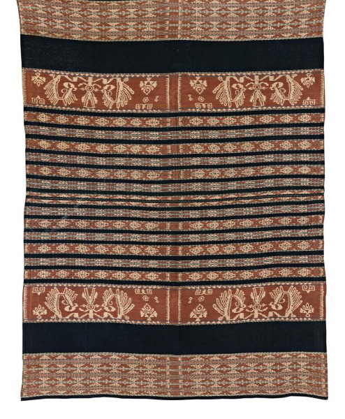 cotton, warp ikat. Motif in white on red (morinda root) bands, alternated with narrow bands in indigo blue. The ikat design band in white is counterbalanced by a plain area and subsidiary bands carrying smaller ikat designs