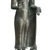 bronze figure of standing Buddha with robe draped across body and thrown over the left shoulder, the right shoulder bare. The robe clings to his body and reveals the forms of his torso underneath. The Buddha is making the gesture of protection or discussion with the right hand, and the left hand is in the boon bestowing gesture. He has long earlobes and the hair comes upwards to a flat cranial protuberance (usnisa)