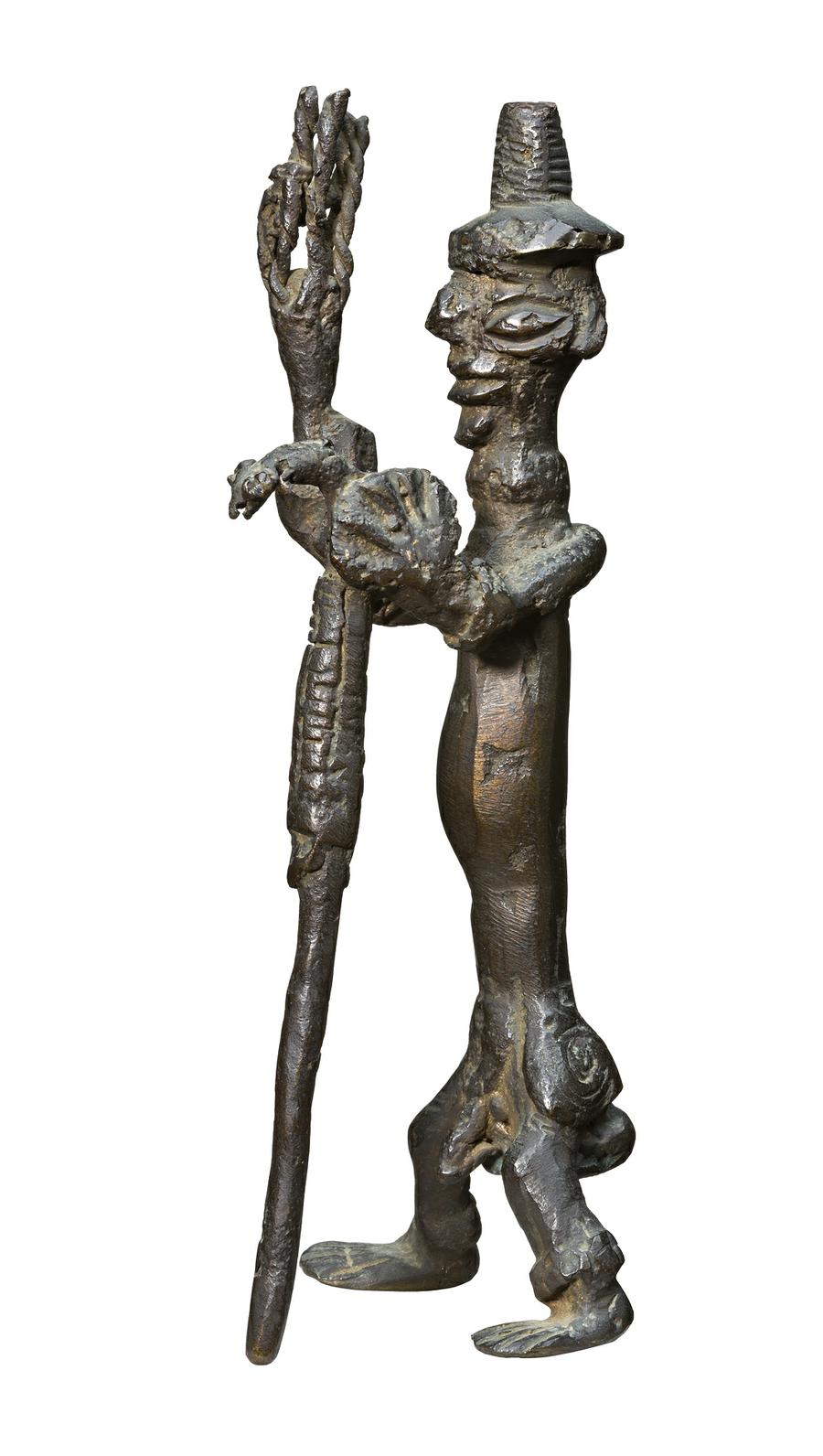 Friend's African manuscript indicates that he researched the history and techniques of Benin bronze work of Nigeria quite extensively, and these small sculptures cast through the lost-wax method reflect his interests of the time. The Yoruba people of Ikerre were known particularly for their beautifully carved fetishes, a number of which Friend collected, and which became amongst his most cherished possessions. However he deplored the vulgarisation of the ancient crafts of West Africa and hoped that they might be revived through new designs: 'The brassworkers now turned from the making of plaques which they had lost the skill to produce, to making stiff and stilted copies of the old heads - poorly cast affairs with mounds of ornamental headdress dwarfing the little simple face depicted with salutary negligence. And then ashtrays - the final degradation - and putrid petty knicknacks that Hausa [British soldiers] men hawk all over the country for a few bob a time. These find a fairly ready market among the Europeans, who, having at last reduced an art to trash, like it that way. This is a depressing history to give. Yet there is hope for a rebirth of craft and new designs.'1