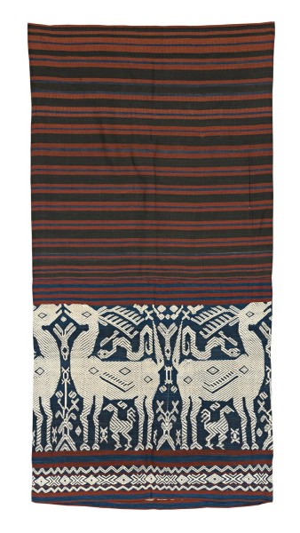 cotton, ikat pattern in central band featuring deer motif flanked by red and blue stripes