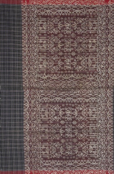 supplementary weft weave. Constructed of two woven panels, joined and seamed to form a tube. The large central field is decorated with weft ikat in gold thread with a design of birds and ships. This is in the Bugis or Makassar style of South Sulawesi, which became the dominant royal style in Sumbawa