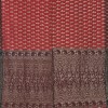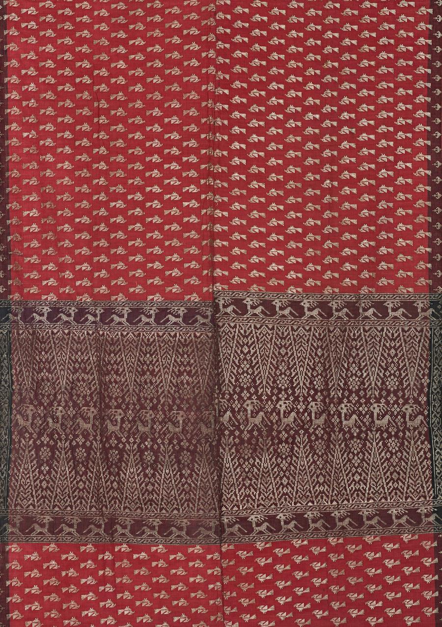 supplementary weft weave. Red body decorated with repeating animal figure motif, the central panel is maroon with deer and tumpal(triangle) design in metallic thread