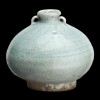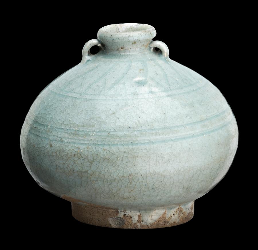 globular body and short neck with two ring handles and a band of petals decorating the shoulder. Medium green, glassy glaze