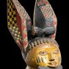 wood painted black, yellow and red, in the form of a human head with a small drum above the forehead, and large stylised ears, each carved with motifs of a lizard and crown, with a carved lizard figure on the back of the head between the stylised ears