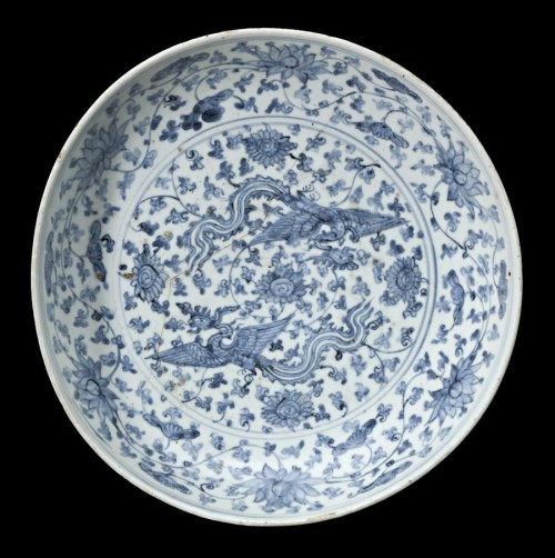 porcelain with underglaze blue decoration in design of cranes enclosed by a band of peony flowers