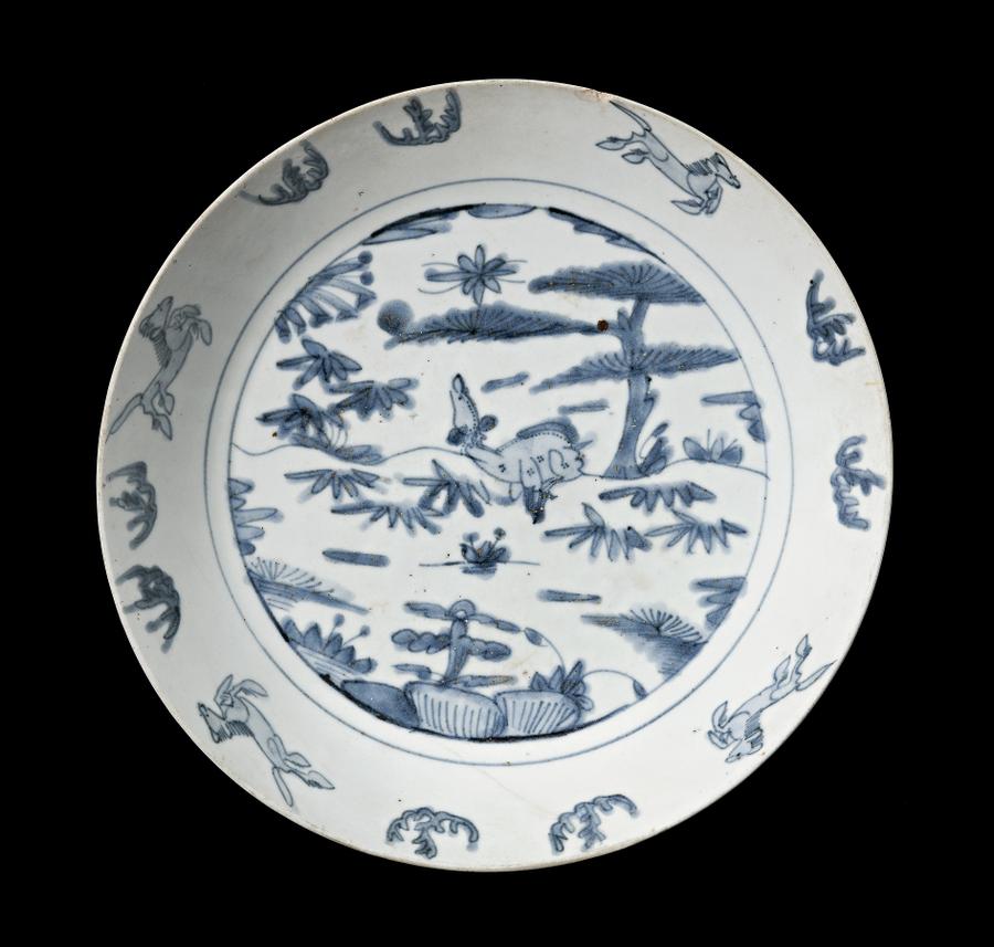 porcelain with underglaze blue decoration. Central medallion features deer and trees, enclosed by a band of deer figures