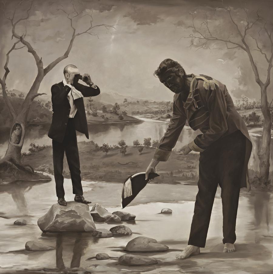 In this ambiguous visual narrative, Bush alludes to several celebrated characters in the history of Australia's colonisation. Set in inimitably Australian bushland, we encounter two eccentric figures, both seemingly at odds with their surroundings. Balancing on a large rock, a navigator immaculately dressed in modern attire surveys the foreign landscape. In the foreground a bare-footed man painted in black-face "donning an elaborate European costume that recalls a uniform donated to Aboriginal explorer and entertainer Bungaree bows forward with his hat, welcoming us to his land. As is common for the artist, he paints himself seamlessly into the composition, here in the form of the native protagonist.