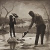 In our image Bush alludes to the idea of historical accuracy through black and white documentation, but this facade belies the wry absurdity of the image. When we look closely, we see a joke that sums up so much 19th century historical painting and journalism: the heroic explorer whose journey promised great riches and rewards, yet in reality delivered only tragedy and disappointment.