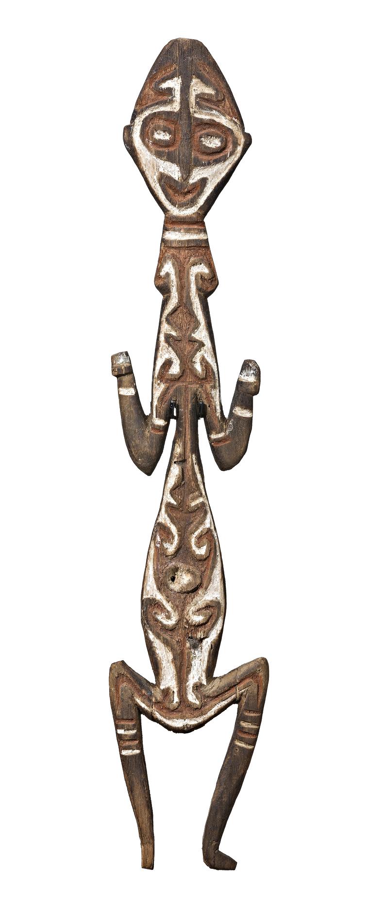 These energetic and symmetrical silhouette carved sculptures are known as Bioma figures. They are spirit images and form part of a large presentation of objects in men's ceremonial houses in the Papuan Gulf. The sculptures give us a glimpse of how the people imagined the appearance, form and character of the spirits.