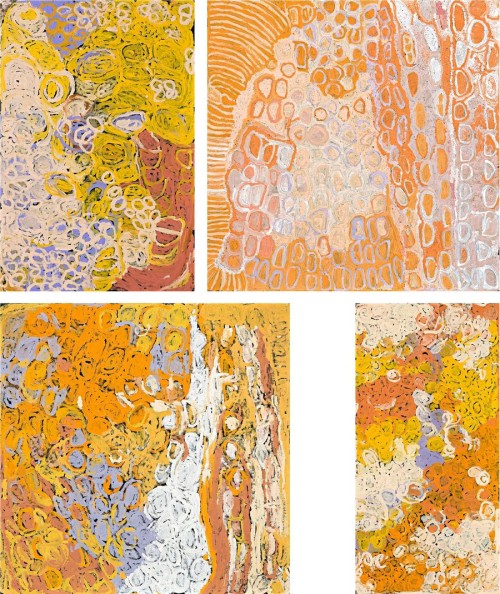 This suite of four paintings depicts designs associated with the travels of the Kungka Kutjarra (Two Ancestral Women). During ancestral times a group of women visited this site, holding ceremonies associated with the area before continuing their travels north to Kaakuratintja (Lake MacDonald) and later the Kintore area. While at the site, the two women were digging for the small animal Kuningka (Western Quoll). These animals usually live in burrows dug by other animals such as the burrowing Bettong or rabbits. The lines in the painting represent spun hair-string which is used for making nyimparra (hair-belts), which are worn by both men and women during ceremonies.