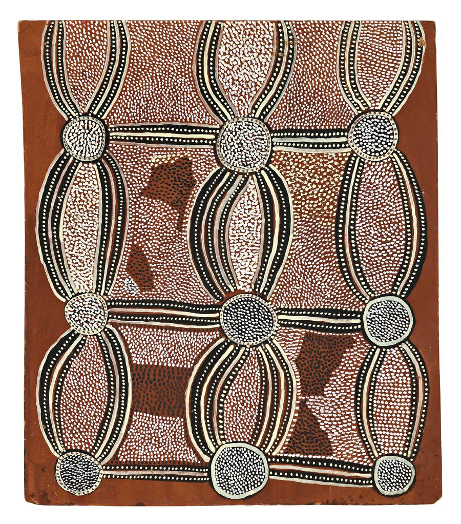This work is accompanied by a document of authenticity prepared by Geoffrey Barton, which states: 'The circular forms, with internal dotting pattern, here represent stylised trees, bushes, grass plants, possibly the desert oak tree, unique to the Western Desert. This is part of a map landscape of Pintupi homelands of the Gibson Desert, Western Australia.